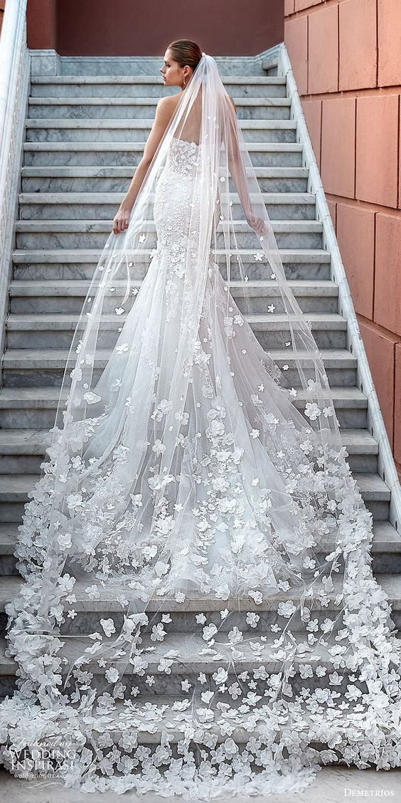 Ascending the steps to matrimonial bliss, we find a bride enveloped in a lace mermaid gown adorned with a sea of blossoms on its long train. The flowers, crafted with the finest lace, seem to bloom directly from the fabric, creating a timeless and classy elegant aura. This dress, paired with a simple tulle veil, speaks to the bride who dreams of a simple elegant yet aesthetic celebration.