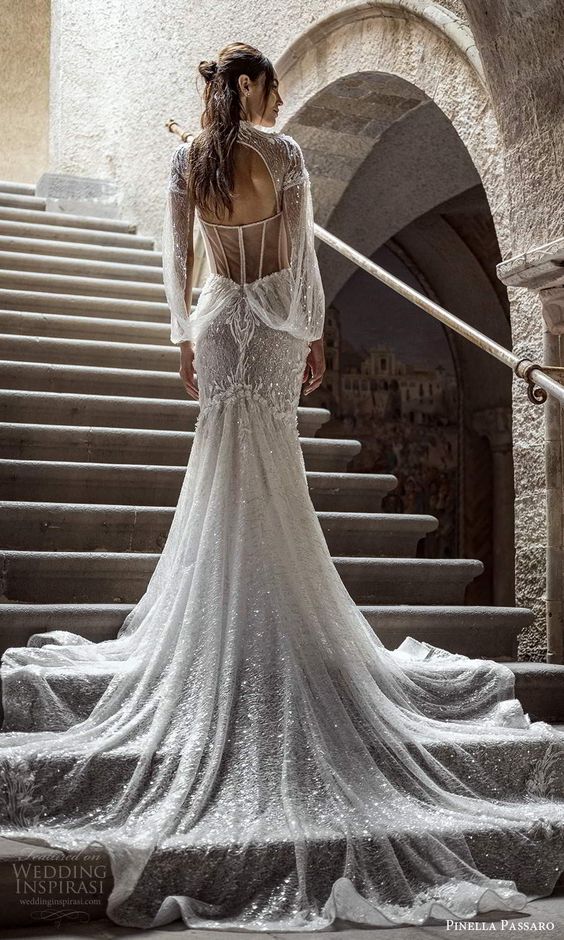 In the quiet solace of an ancient stairwell, a gown shines with a thousand sparkles. The sleeve backless design invites an air of mystery and allure, while the shimmering long train reflects even the faintest light, promising a 2024 trend of subtle glamour. This gown is perfect for an evening of elegance, where the bride is the star under the soft glow of candlelight.