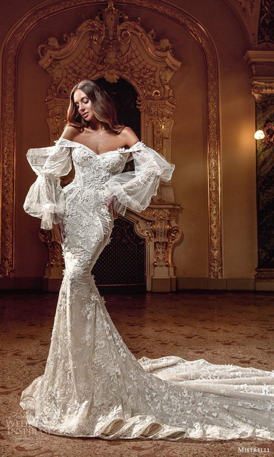 Captured in a moment of serene contemplation, this gown with sleeve off shoulder elegance and dramatic puff sleeves makes a statement of classy elegant fashion. The long train of immaculate lace promises a walk down the aisle that is nothing short of majestic, a true 2024 trend for the bride who desires to blend timeless with theatrical.