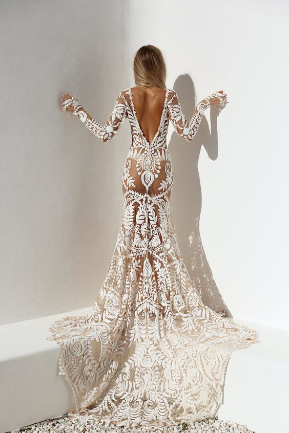 Next, we encounter a striking gown that whispers vintage tales in a modern simple language. The silhouette is a lace mermaid vintage bridal gown that flatters with a sleeve high neck design, inviting a sense of nobility and grace. The open back merges sleeve backless charm with modern elegance, while the detailed lacework brings a timeless texture to the ensemble. Ideal for a sophisticated, intimate wedding, this gown is a canvas for personal expression, inviting brides to pair it with cathedral veils or keep it minimal yet profound.