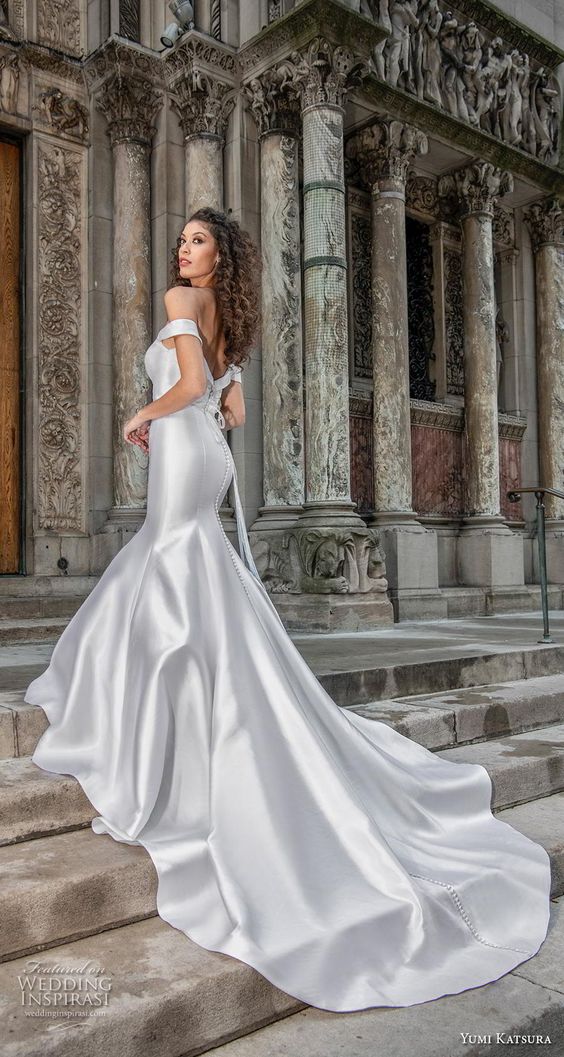 Here, we see a return to modern simple sophistication. The gown presents a sleek silhouette with simple lines that speak volumes. The off the shoulder cut adds a playful yet classy elegant feel, ideal for the understated bride who delights in minimalist designs. Its train, while less grandiose, trails behind with a timeless elegance, making it perfect for a variety of venues from beachfront vows to chic city nuptials.