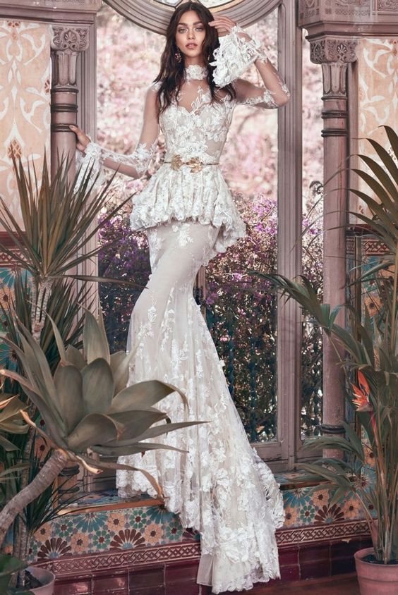 Envision a gown that evokes the enchantment of a secret garden; this is a creation that does just that. With a peplum waist and lace mermaid silhouette, it offers a classy elegant feel that’s undeniably whimsical. The long train, adorned with cascading lace and a delicate golden belt, adds a touch of aesthetic vintage charm. This gown is a picturesque choice for the bride with a penchant for timeless romance and a flair for the dramatic.