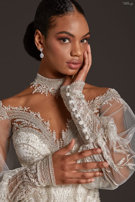 Whimsy and wonder come together in this enchanting long sleeve gown. The romantic boho feel is captured through sheer fabrics and delicate lace, making it a gown fit for a modern-day princess. This dress, which could be straight out of a vintage fairytale, is ideal for a bride seeking a 2024 trend look that’s both elegant and aesthetically vintage.