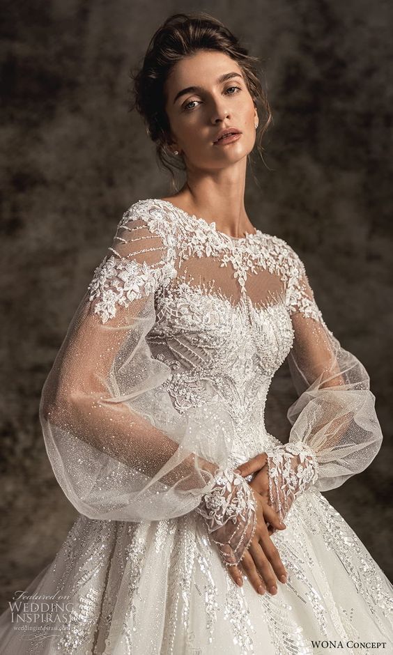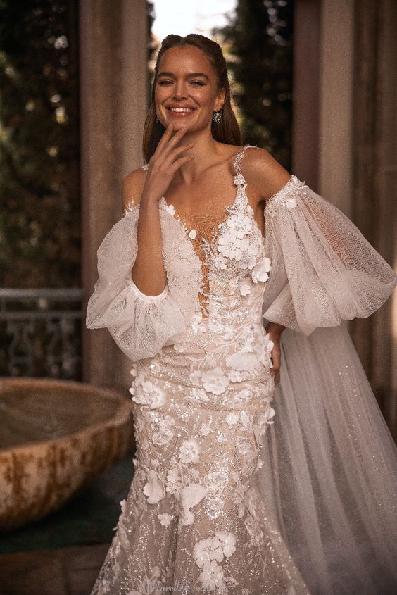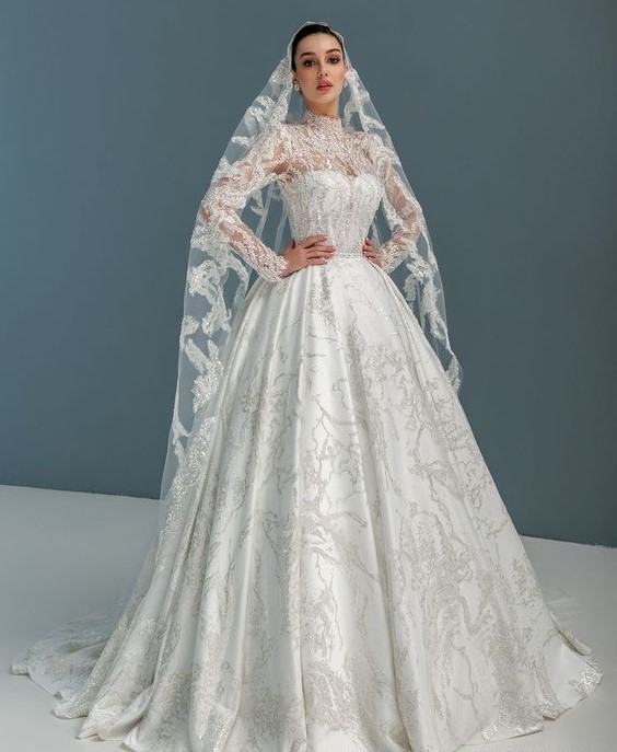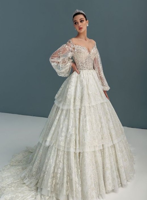 For the bride who desires to merge classy elegant with modern simple, this ballgown is a true work of art. With its full skirt and dramatic lace sleeves, it exudes royal elegance and modern simplicity. This gown’s timeless appeal and detailed lace craftsmanship make it a stunning choice for the 2024 bride who wishes to make a princess statement on her wedding day.