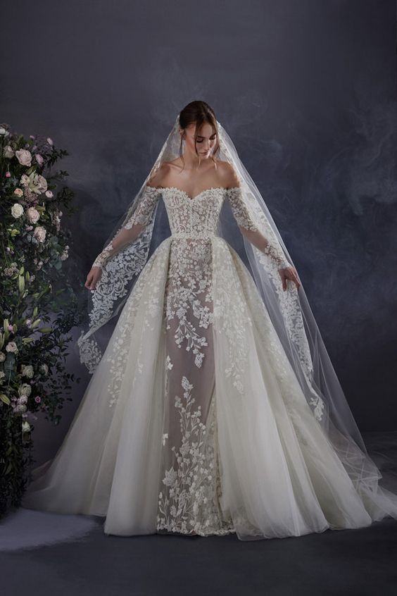 Embracing the grandeur of the ballgown, this majestic dress is a tribute to the 2024 trend of blending vintage with modern elegance. The off-shoulder design accented with detailed lace appliqués exudes a classy elegant demeanor, while the sheer overlay and extended train add a touch of ethereal romance. This gown is not just a dress; it’s a statement of aesthetic vintage luxury, perfect for the bride who dreams of a fairytale princess wedding, surrounded by opulence and timeless elegance.