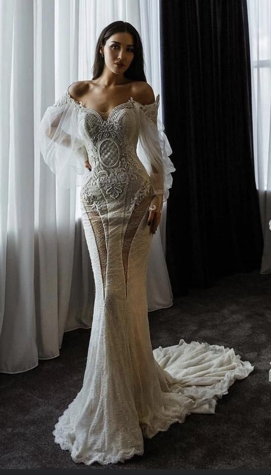 In a striking departure from tradition, this modern simple mermaid dress captures the essence of 2024 trend new with its bold lace patterns and figure-hugging silhouette. The off-shoulder sleeves and intricate beading amplify the modern elegant charm, creating a mesmerizing effect that’s both pretty and sophisticated. Ideal for the bride who wishes to combine the allure of classic lace with a simple elegant shape, this gown stands as a testament to contemporary bridal aesthetics.