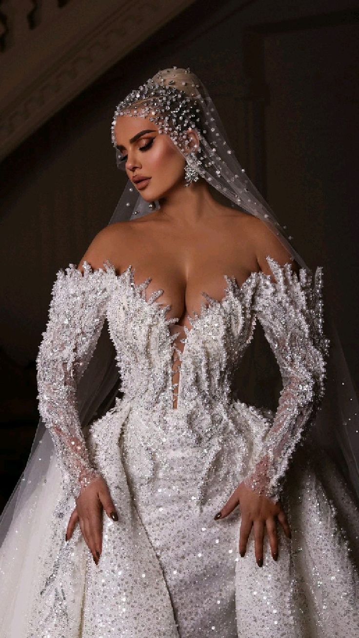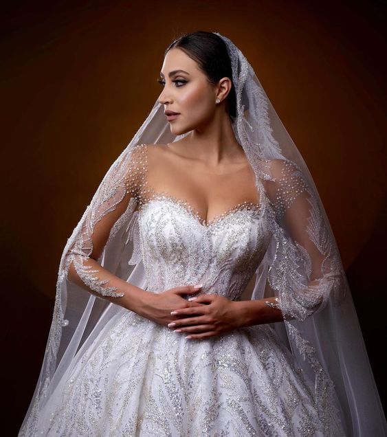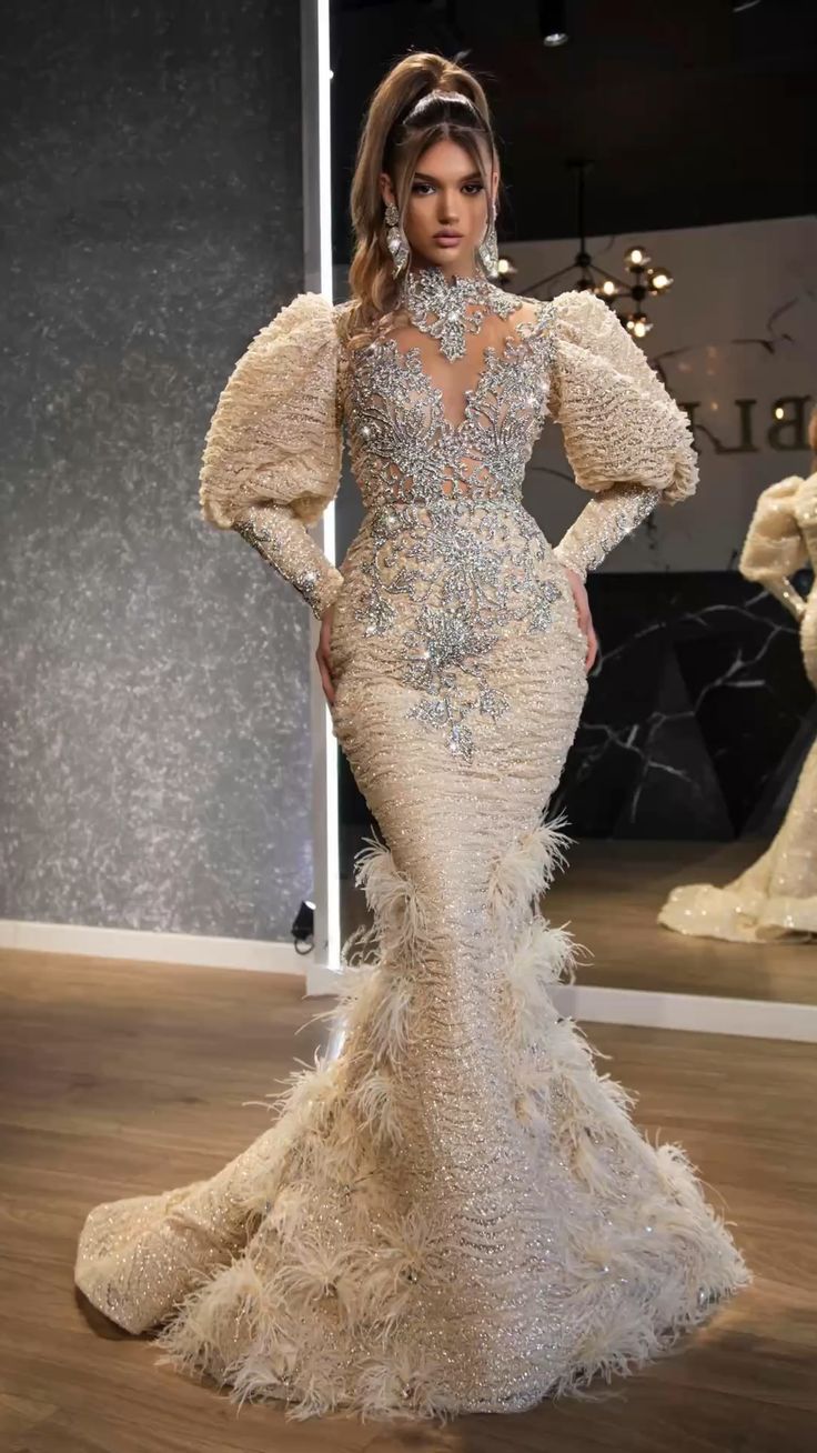 The first ensemble is a breathtaking homage to the classic pear-shaped beauty. With a fitted bodice that cinches at the waist before billowing into a dramatic feathered train, this gown is the definition of perfect shaped women. The intricate beading and off-shoulder design make it an ideal choice for brides with small busts, offering support and style. The grandeur of the skirt balances broad shoulders, making it a stellar choice for women who embody the essence of an hourglass figure.