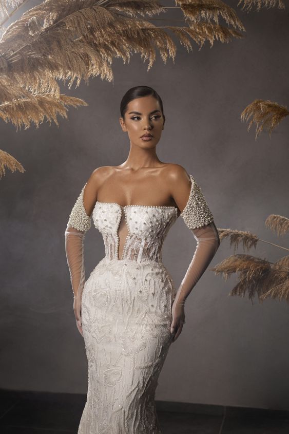 The allure of this off-shoulder sheath gown lies in its intricate beading and delicate sleeves, adding a touch of elegance for for small bust brides. The gown’s silhouette, which closely follows the body’s shape, and the subtle flare at the hem, make it a flattering choice for the rectangle body type, ensuring a look of refined grace.