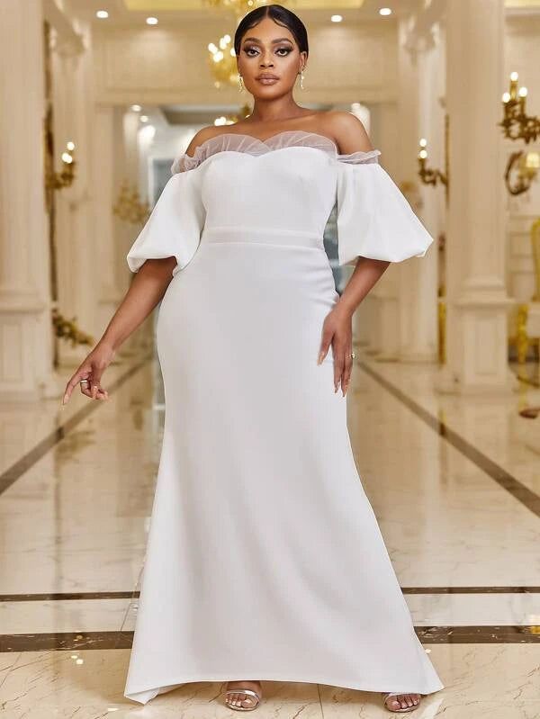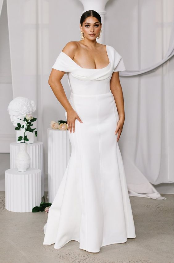 Embracing a modern elegant design, this dress presents a silhouette that celebrates the female form. The off-shoulder neckline dips into a gentle sweetheart shape, offering a classy and cute vibe, while the tailored bodice transitions into a flared mermaid skirt, creating the iconic mermaid silhouette. This simple yet elegant dress is a striking choice for an evening affair, where the sleek lines can be highlighted under soft lighting.
