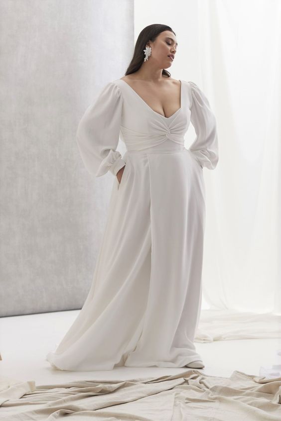 Here we see a gown that defines classy elegance with its long, billowing sleeves and a deep neckline that balances modest coverage with a hint of sensuality. The gathered detail at the bust adds texture and a focal point, leading down to a smooth, flowing skirt. This dress could be the centerpiece of a dream wedding, ideal for a princess-inspired look in a grand ballroom or a modern elegant setting in a sleek city venue.