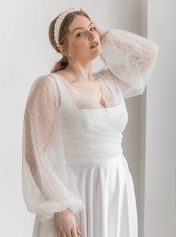 Encased in a sheath of polka-dotted tulle, this long sleeve gown captures a playful yet elegant spirit. The sheer fabric overlays a structured bodice, providing a glimpse of the delicate lace underneath. The simple cut of the skirt complements the detailed sleeves, creating a balanced modern elegant look. This dress would be at home in a whimsical winter wedding or a cute, intimate courthouse ceremony.