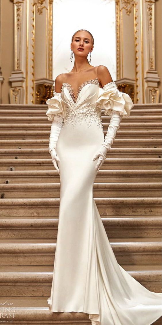 Our seventeenth gown is the embodiment of simple elegant charm with its sleek satin silhouette and dramatic puff sleeves. The sparkly bodice dazzles against the simple satin, providing an exquisite balance of classy elegance and contemporary style. This gown is a testament to the best of wedding dresses mermaid 2024, offering a look that is both timeless and decidedly modern.