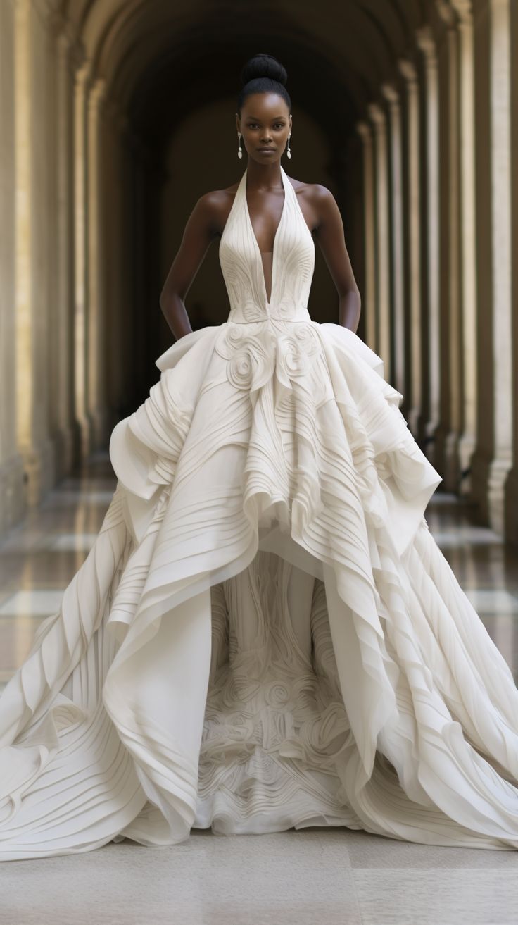 The fourth gown is nothing short of a sculptural masterpiece, pushing the boundaries of luxury wedding dresses mermaid 2024. The ruffled shoulders and dramatic flair of the skirt create a silhouette that’s extravagant and gorgeous, channeling the innovative spirit of designers like Pnina Tornai. It’s a dress that’s crafted not just to be worn, but to be experienced.