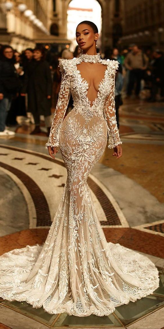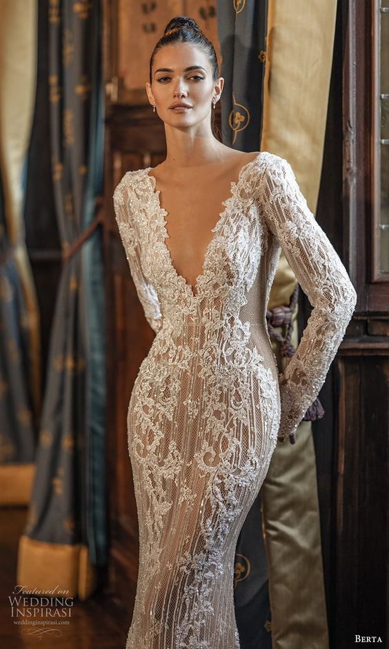 Lastly, the fifth dress revisits the classic mermaid silhouette with a beautiful modern twist. The plunging neckline and intricate floral patterns etched into the fabric add a sense of luxury and stunning detail. It’s a gown that interweaves tradition with modern elegant sensibilities, perfect for the bride who wants to look both timeless and of the moment on her wedding day.