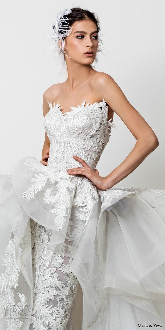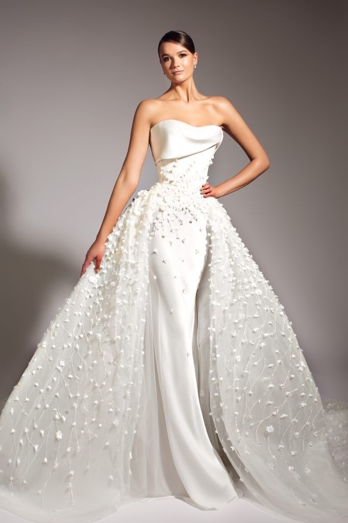 A striking example of contemporary bridal design, this gown features a sleek strapless bodice that transitions into a voluminous skirt with a detachable train, embellished with floral appliqués that seem to float on air. It’s a dress that encapsulates the dream of a modern bride with a penchant for Pnina Tornai’s visionary design and Vera Wang’s clean lines.
