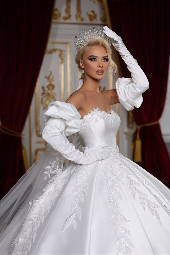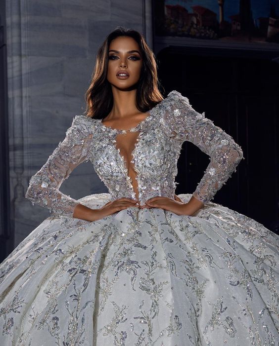 A vision of sparkly and extra allure, this gown is a beacon of majestic beauty. The sheer sleeves and bodice, adorned with delicate beading, create an illusion of a celestial dream coming to life. The expansive skirt, reminiscent of white winter snow, could belong to an ice queen walking down the aisle. For a bride who embodies grace and regality, this gown is the ultimate expression of bridal fantasy. Styling with a crystal-encrusted headpiece and a long, embellished veil will only enhance the magical aura of this dress.