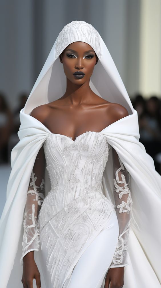 The final gown in our lineup is a bold statement piece with a hooded detachable train, giving it a unique and dramatic edge. The fitted bodice with its sheer, long sleeves and the white beaded detailing throughout the gown make it an exquisite choice for a bride who embodies the ice queen aesthetic, ready to captivate her audience.