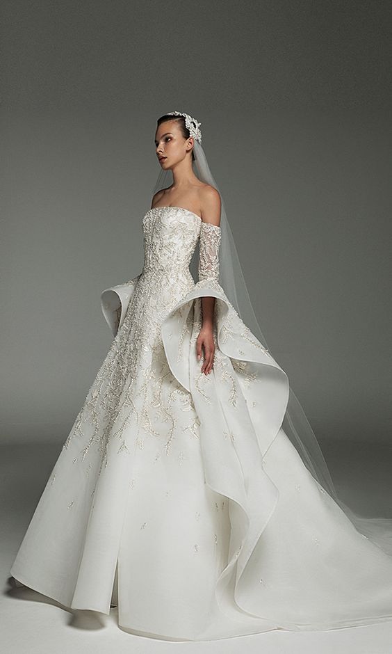 Here we witness the quintessence of princess and fairytale ambitions. The gown’s grand silhouette paired with a sweetheart neckline radiates the quintessential bridal dream. Embraced by pearl beaded details, it promises a Pnina Tornai-esque spectacle. The off-shoulder design invites a touch of whimsy, making it an idyllic choice for the bride who cherishes storybook endings. To complete the look, a tiara and long, flowing veil will transport you to a realm where every bride is a princess.