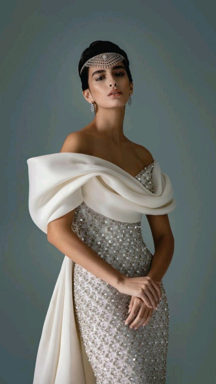 The fashion-forward bride will find an ally in this gown’s avant-garde off shoulder design. The bodice is a constellation of sparkly embellishments, which transitions seamlessly into a cascading extra large fold that wraps around the shoulders. It’s a dream dress for those who covet a best blend of drama and sophistication, ideal for a fairytale wedding in a metropolitan setting.