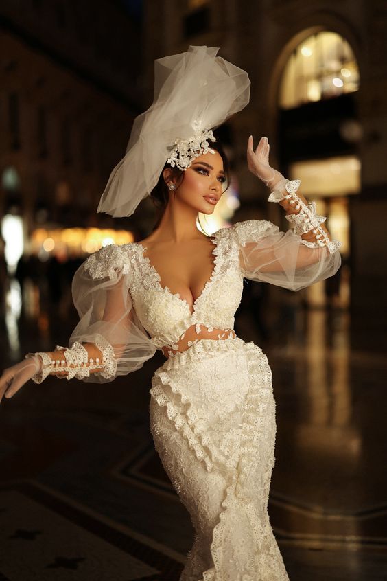Here we see a gown that exudes romance with its all-over lace design and sheer, billowing long sleeves. The gown’s fitted bodice and flared skirt highlight the bride’s figure, while the intricate lace patterning adds depth and texture to the sparkly aesthetic. The sweetheart neckline peeks through the sheer overlay, offering a glimpse of skin that is tantalizing yet tasteful.