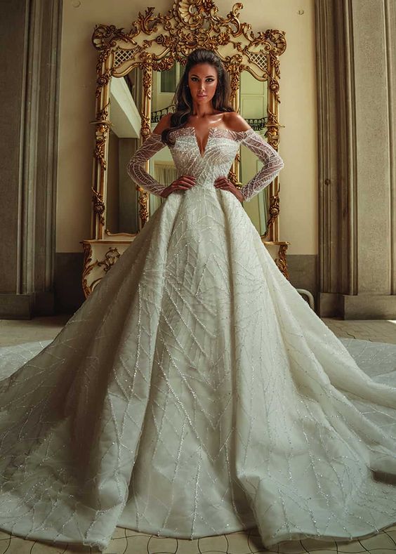 In the realm of elegant long sleeves and sparkly adornments, this gown stands as a testament to timeless beauty. The off the shoulder long sleeve design exudes a sense of royal grace, while the intricate beading whispers tales of luxury and opulence. This dress, reminiscent of Vera Wang’s artistic vision, offers a modest yet alluring appeal, perfect for the bride seeking both tradition and contemporary flair. For styling, consider a swept-up hairstyle to showcase the shoulders and a delicate pearl necklace to echo the gown’s embellishments.