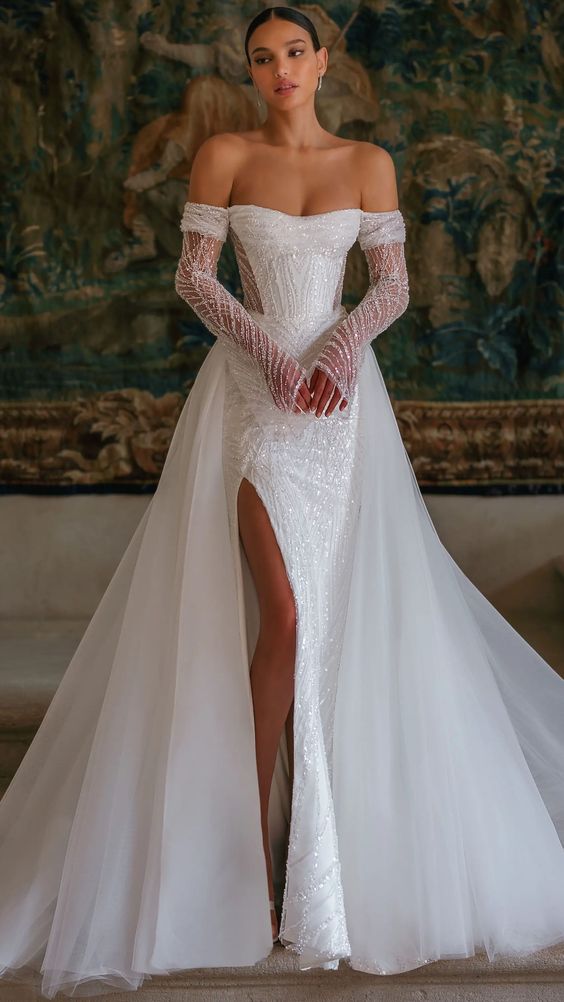 In a breathtaking display of modern artistry, this wedding dress long 2024 steals the spotlight. A statuesque gown with a bodice that resembles a blooming rose, it’s a visionary take on the classic train ball gown. This masterpiece is a celebration of structure and fluidity, making it an exceptional choice for the bride who is an aficionado of cutting-edge design and wishes to incorporate a sleeve off shoulder look into her reception ensemble.