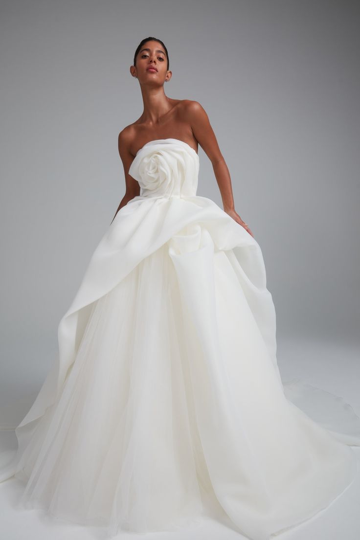 This gown is a modern fairytale come to life, merging the sleeve ball gown with a sleek strapless neckline. The full skirt and train hint at a traditional bridal narrative, while the simplicity of the bodice offers a contemporary edge. It’s a dress that will carry the bride through her reception and into her after party with a regal air.