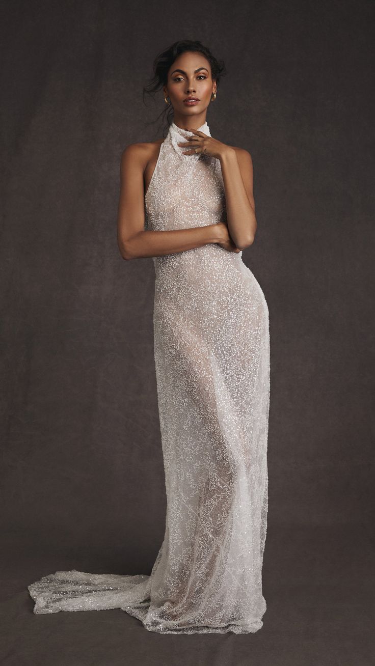 Elegance is redefined in this sequin-embellished gown, a striking homage to sleeve elegant and sleeve high neck designs. It embodies the glitz of Vegas weddings, wrapping the bride in a sheath of glittering fabric that cascades into a delicate train. This dress, perfect for the after party, combines the allure of the 50s with a sleek, contemporary silhouette, ideal for the bride who shines as bright as her future.