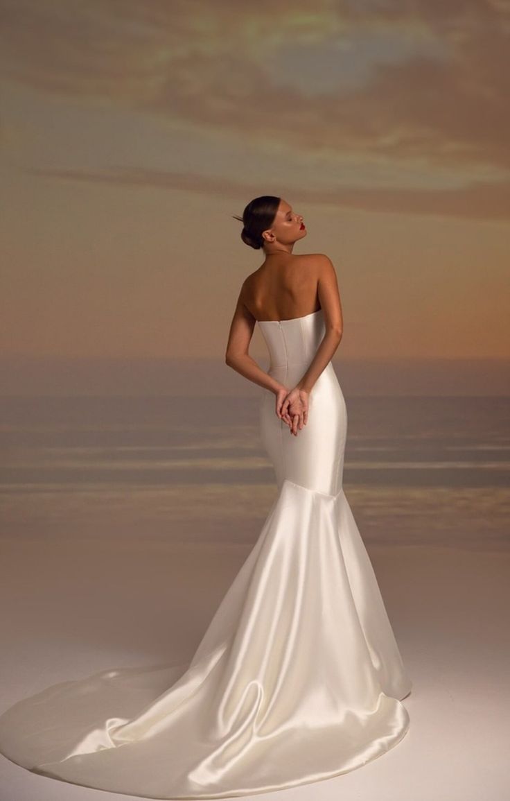 This gown captures the spirit of the ocean – free, untamed, and graceful. With a form-fitting silhouette that flares into a gentle train, it’s a contemporary take on the sleeve princess style. The understated elegance of this dress makes it perfect for a beach reception or a white after party, embodying the essence of a modern-day siren.