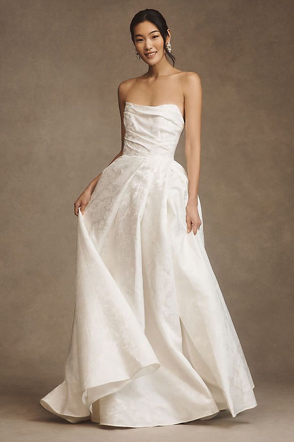 The wedding dress long 2024 finds a new voice in this textured masterpiece. With a strapless design that exudes a timeless sleeve simple charm, the gown’s silhouette is a tribute to the 50s ballroom elegance. It’s an ideal selection for the bride who appreciates the subtle interplay of texture and form, and who might choose this as a stately option for her reception or a classic after party.
