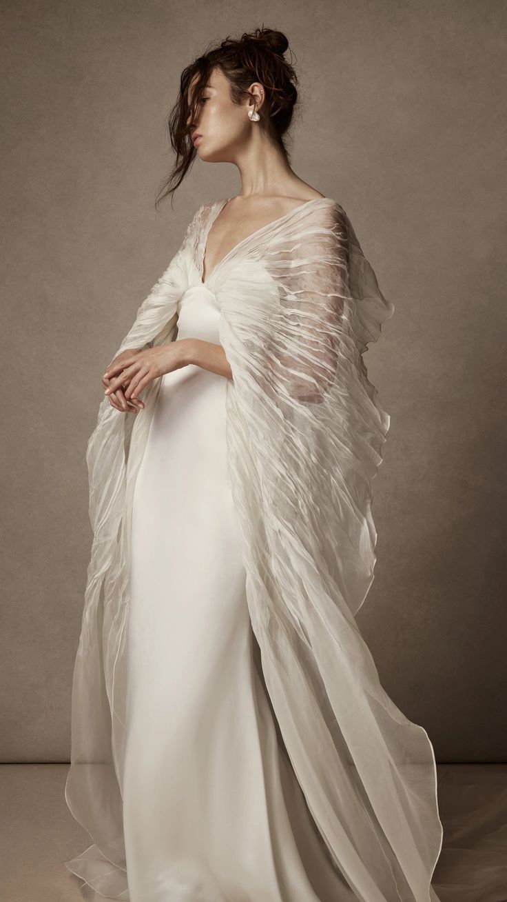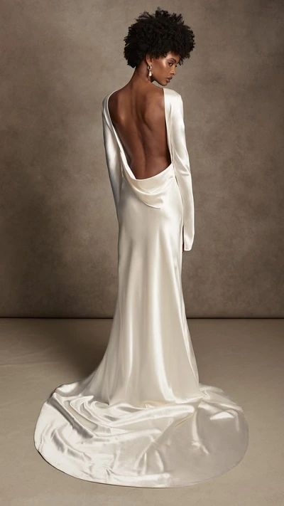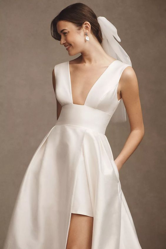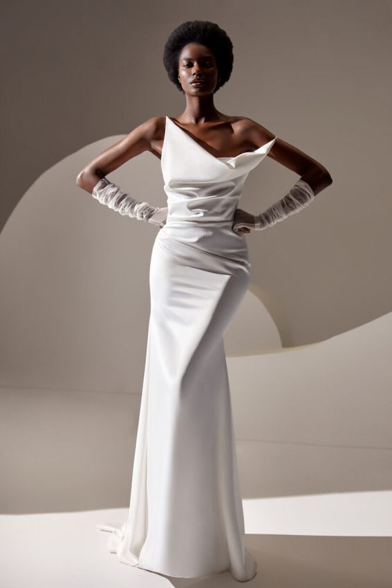With a nod to the 60s babydoll style, this gown brings a playful yet sophisticated essence to the wedding dress long 2024 collection. The single-shoulder design is adorned with a graceful bow, adding a touch of whimsy. This dress, with its sleek lines and sumptuous fabric, would be a stunning choice for a modern reception or an elegant after party, especially for brides seeking a sleeve simple yet stunning look.