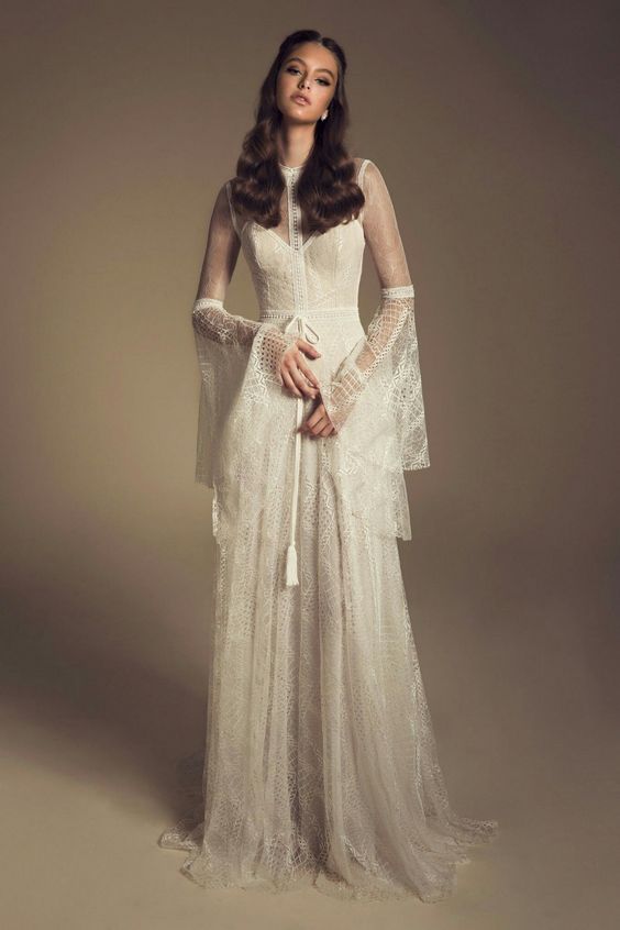 In a nod to the 1950s, this gown wraps the bride in a lace-adorned fantasy, complete with sleeve lace that whispers tales of vintage romance. The high neckline and flowing bell sleeves embody the sleeve elegant and sleeve princess styles of yesteryears, reimagined for today’s bride who cherishes the past’s charm. This gown is perfect for a bride with a penchant for the poetic and the timeless, an ethereal choice for a wedding steeped in nostalgia.