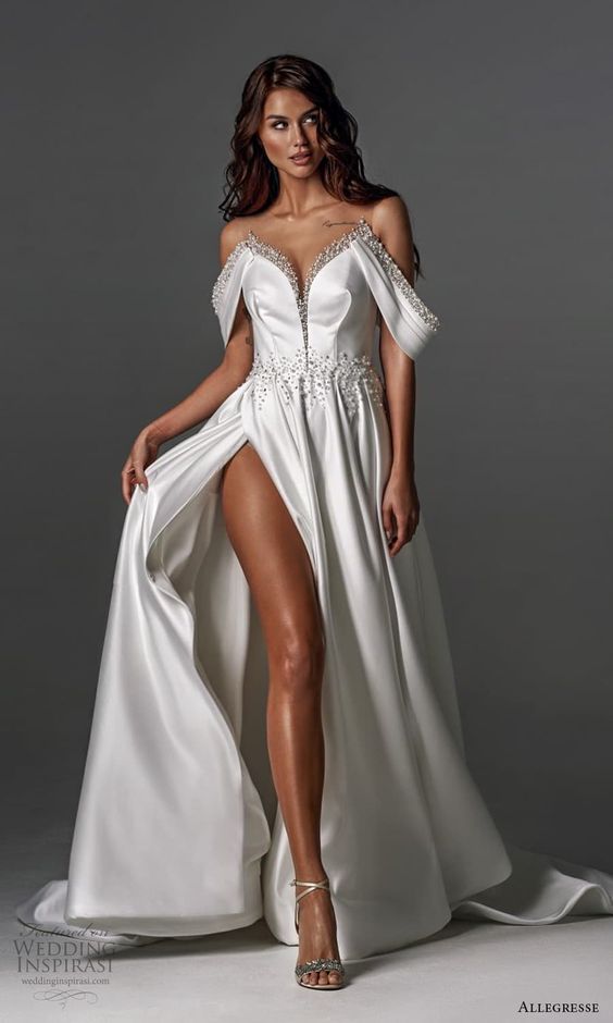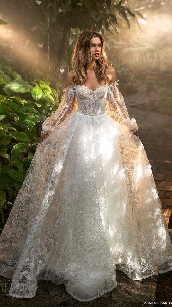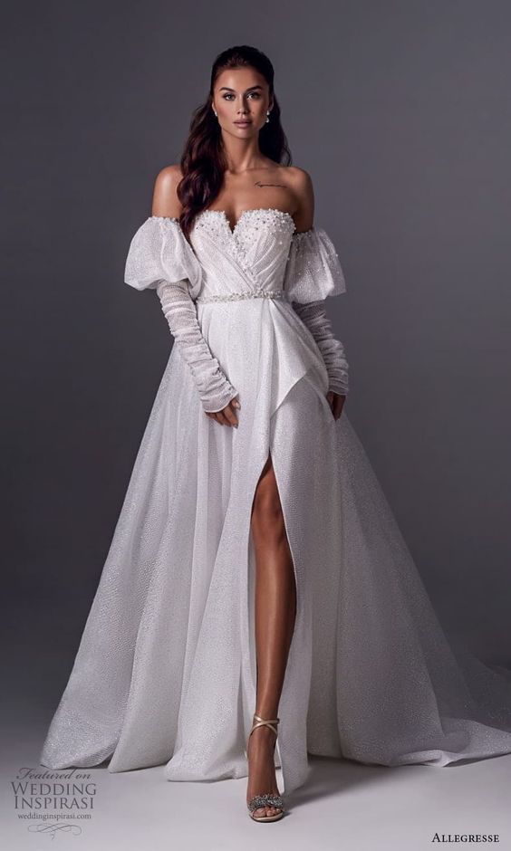 In a breathtaking display of modern artistry, this wedding dress long 2024 steals the spotlight. A statuesque gown with a bodice that resembles a blooming rose, it’s a visionary take on the classic train ball gown. This masterpiece is a celebration of structure and fluidity, making it an exceptional choice for the bride who is an aficionado of cutting-edge design and wishes to incorporate a sleeve off shoulder look into her reception ensemble.
