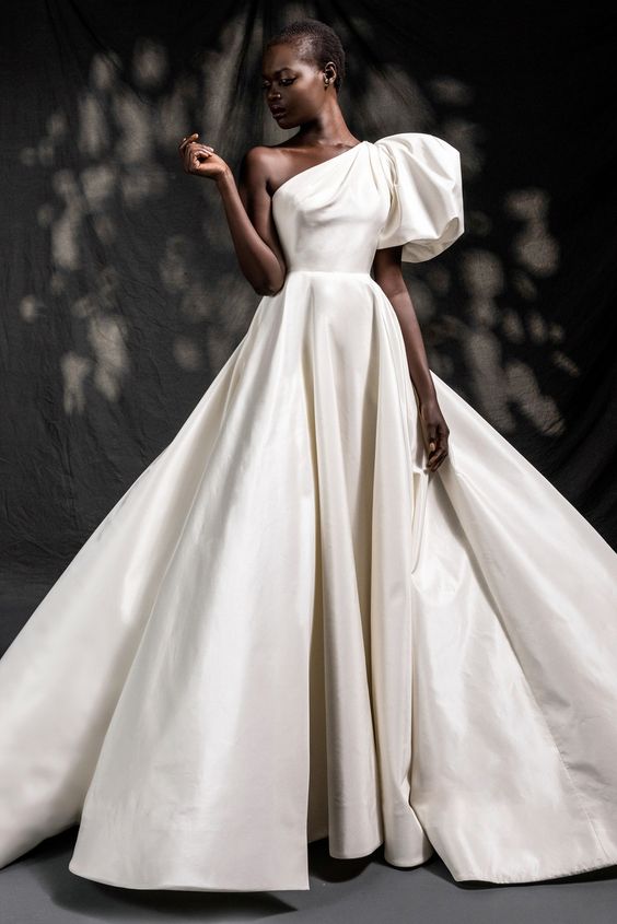 With a nod to the 60s babydoll style, this gown brings a playful yet sophisticated essence to the wedding dress long 2024 collection. The single-shoulder design is adorned with a graceful bow, adding a touch of whimsy. This dress, with its sleek lines and sumptuous fabric, would be a stunning choice for a modern reception or an elegant after party, especially for brides seeking a sleeve simple yet stunning look.