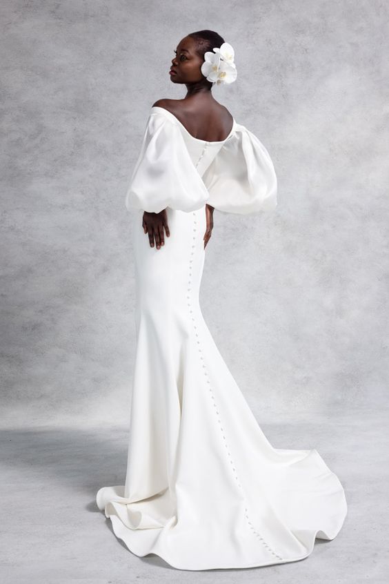 This gown stands as a serene statement of sophistication, with its off-shoulder design and flowing bell sleeves. The simple elegant line of the dress flows into a graceful train, perfect for a forest wedding or any vintage-inspired setting. It’s an ideal choice for the black woman who values elegance and simplicity.