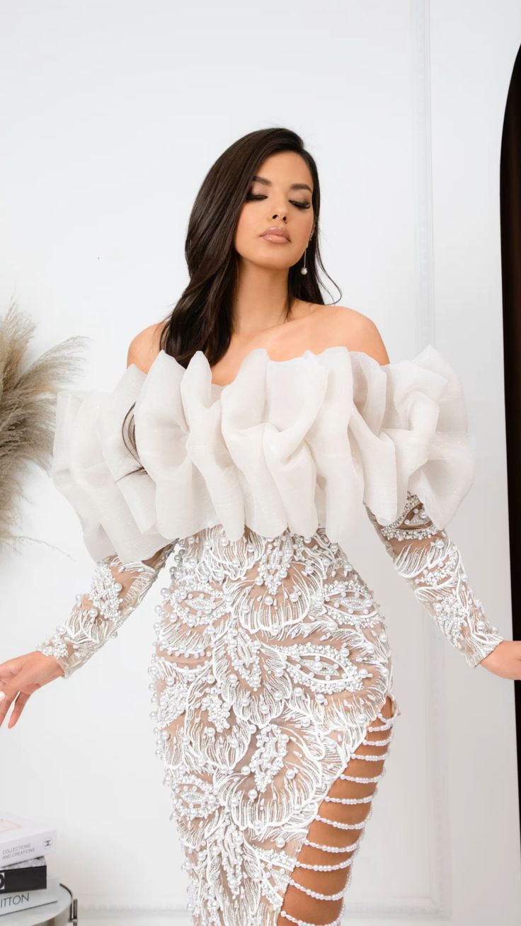 This gown is a masterpiece of intricate detailing, perfect for the bride who desires a modern elegant look with a touch of glamour. The combination of lace and beaded embellishments creates an aesthetic that’s both classy elegant and boldly contemporary. With its high neck and dramatic ruffles, it’s a gown that celebrates both boho and lace in a mermaid silhouette.