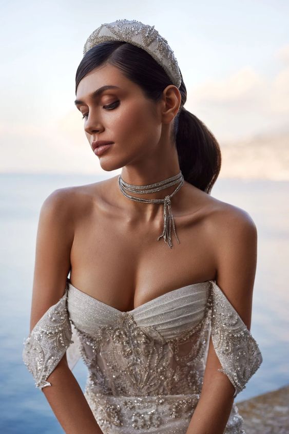 Here we witness the splendor of sparkle and couture coming together in a gown fit for royalty. This dress, with its off-shoulder sleeves and intricately beaded bodice, is a masterpiece of craftsmanship. The elegant choker adds a touch of modern elegance, while the sparkle white of the gown promises a bride’s radiant presence. It’s a dress that redefines 2024 bridal trends, offering a blend of tradition and modern simple magnificence.