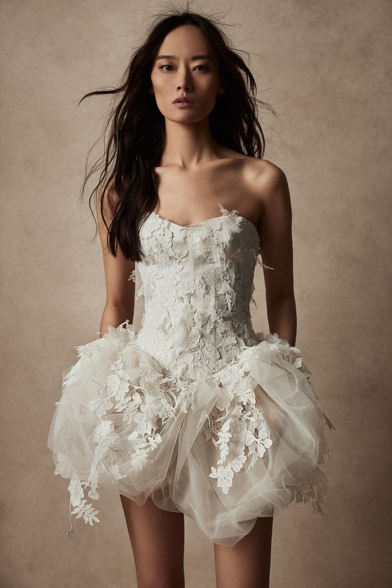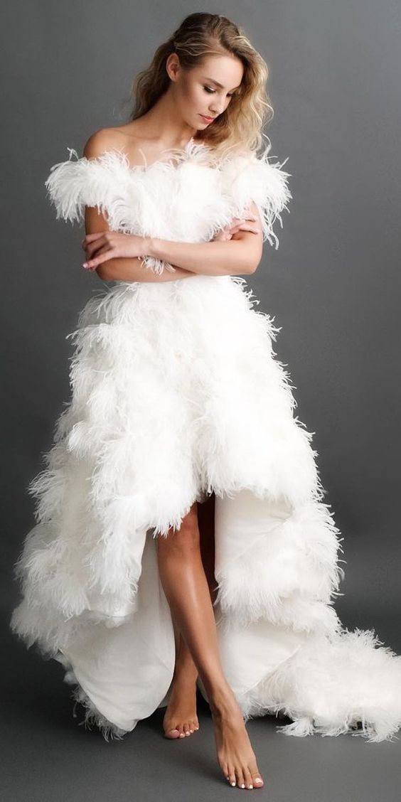 Embracing a whimsical and fairytale aesthetic, this short dress with layers of plush feathers is a statement of bold femininity. The soft texture and the playful hemline create a vintage feel with a modern twist. It’s a dress that would capture the heart of a bride who is looking for a simple elegant yet dramatic piece for her special day, resonating with the 2024 trend of unique bridal expressions.