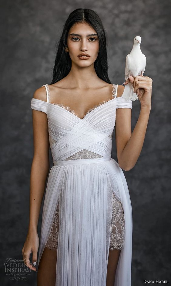 This dress brings to life the minimalist trend with its off-shoulder design and dotted tulle. It’s a vision of understated elegance, with a texture that speaks of subtle intricacy. The long sleeve design adds a touch of timeless grace, making it a perfect choice for a simple elegant wedding in 2024.