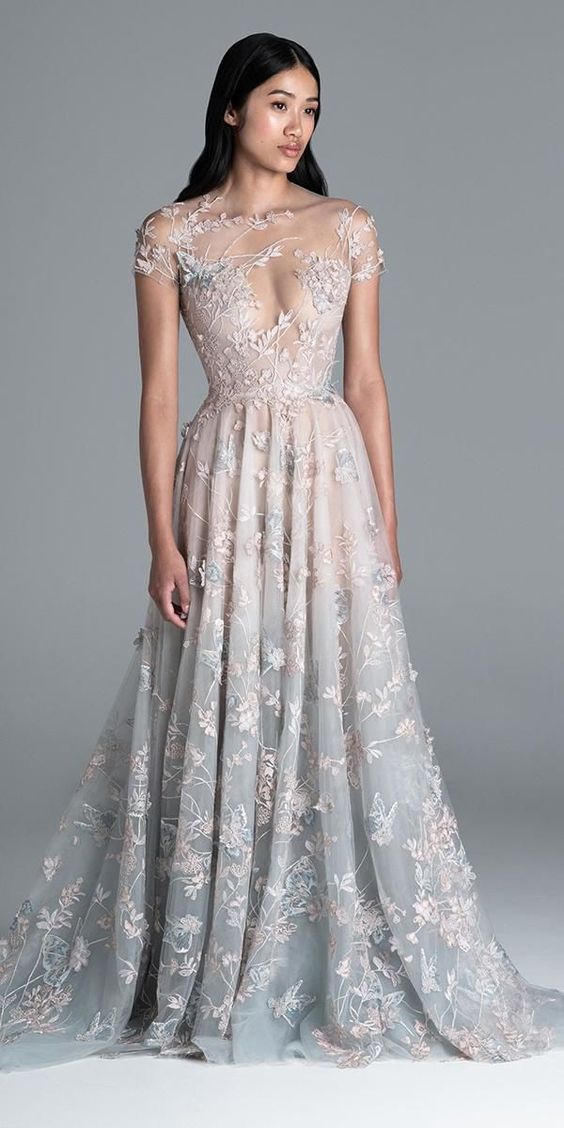 Our next highlight is an ethereal creation, a ball gown with an overlay of intricate embroidery, casting a spell of enchantment. The sparkle of the embedded crystals interwoven with delicate floral patterns evokes the freshness of spring. This gown would suit someone who carries a love for vintage aesthetics but walks confidently in the modern world. It is a celebration of the 2024 trend of blending traditional craftsmanship with contemporary design.