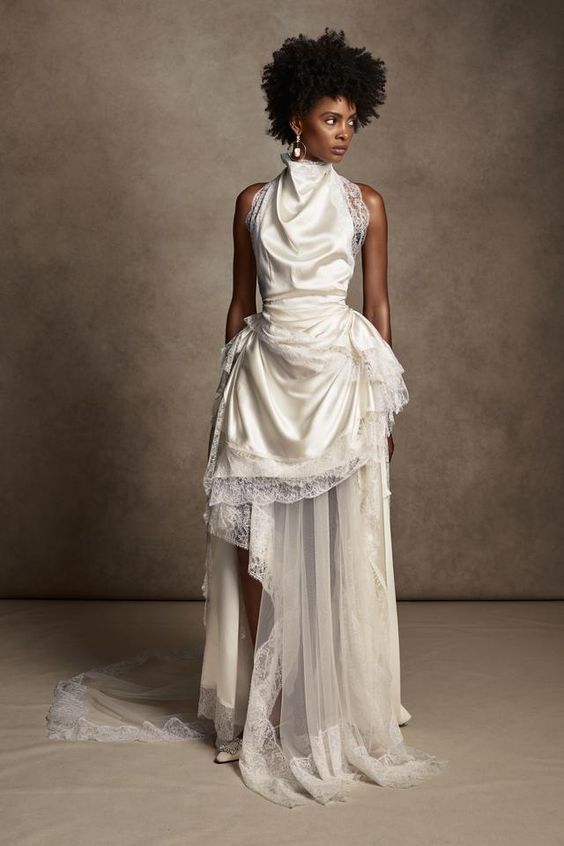 In contrast to the preceding tulle and embroidery, here we have a gown that speaks volumes of minimalist design while maintaining an air of classy elegance. This satin masterpiece, with its high neckline and contrasting lace accents, offers a nod to modern simple designs that champion less as more. The asymmetrical layering of the satin skirt adds a touch of avant-garde, ideal for the bride who is both a guest and the star of her own wedding.