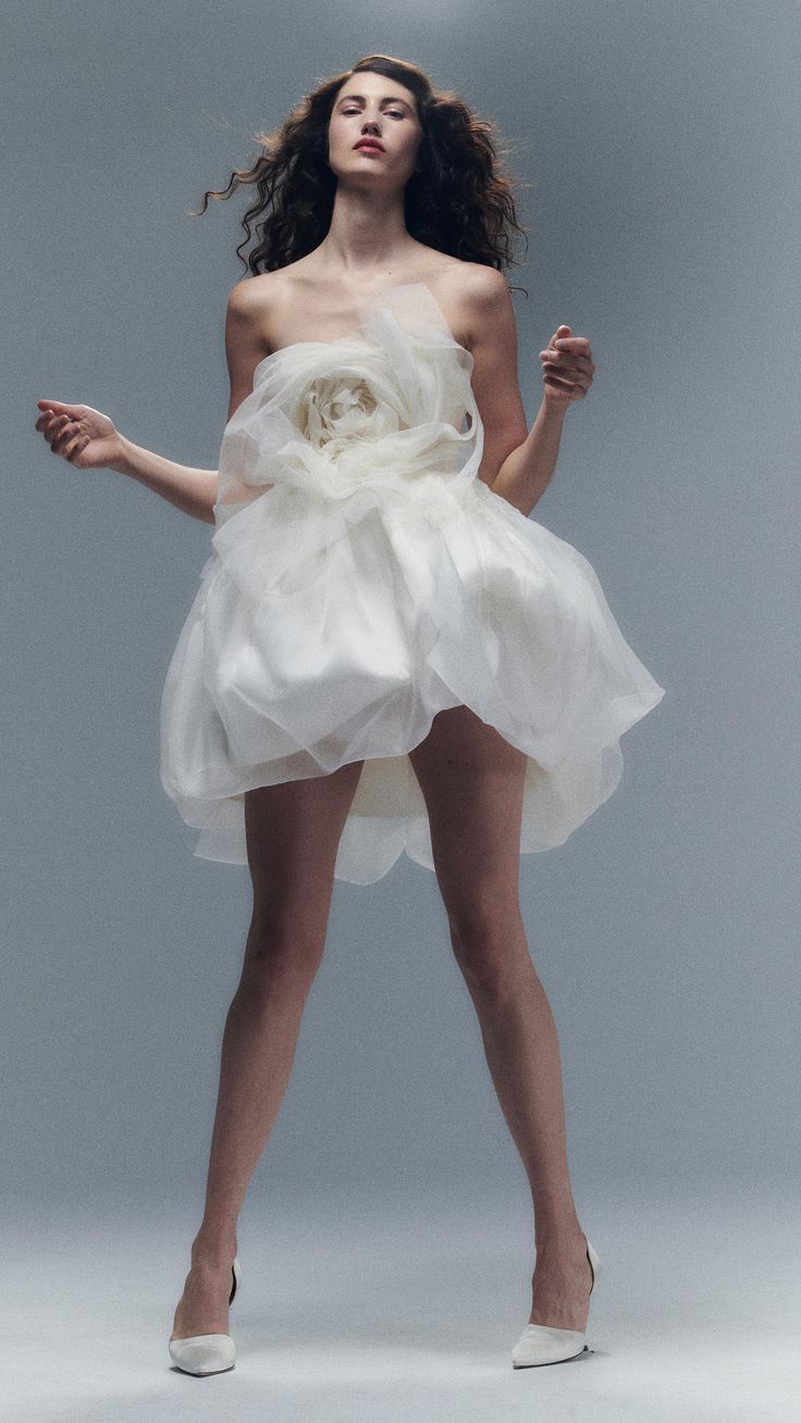 Completing our exquisite selection is a gown that’s like a poem crafted in fabric. The floral motifs and short playful skirt interweave to tell a story of romance and whimsy. This dress, with its elegant silhouette and airy feel, is a modern take on princess fairy tales, destined for a bride who dreams of a 2024 wedding filled with charm and personality.