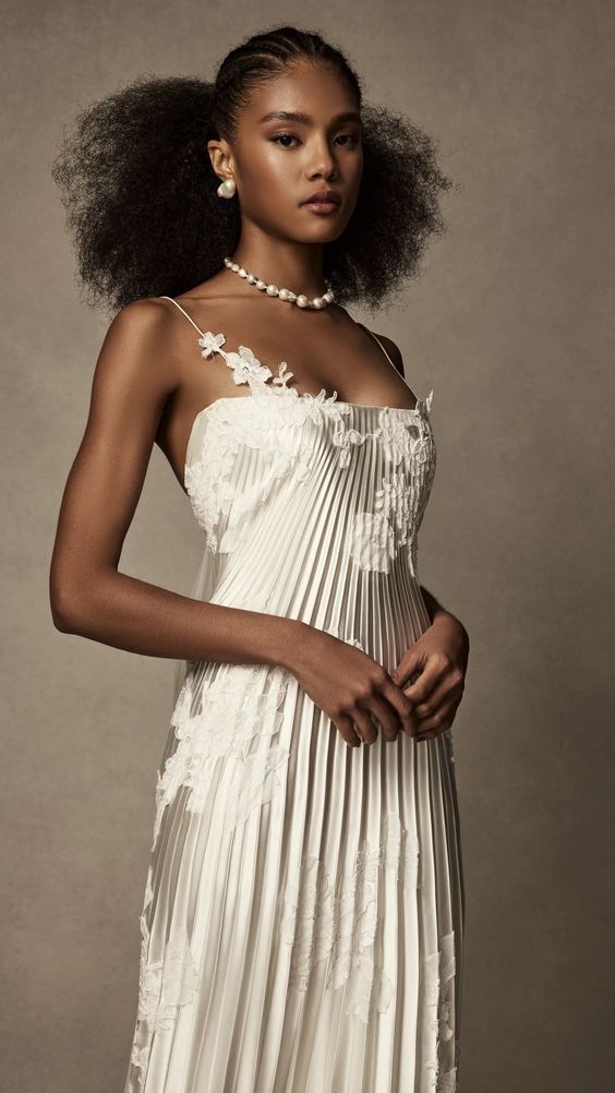 This gown is a symphony of pleats, presenting a simple elegant silhouette that is both classic and contemporary. Adorned with delicate floral appliquΓ©s, it offers a tactile dimension that is both modern and timeless. This dress could be the dream of a bride who values elegance and subtlety, offering a modern simple take on the 2024 trend of understated luxury.