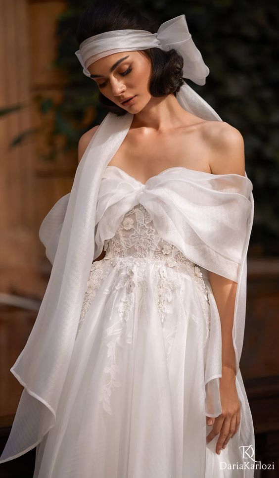 This sleek silhouette, with off-shoulder lace sleeves and a form-fitting design, brings to mind the modern minimalism of Meghan Markle combined with the elegant sophistication of Audrey Hepburn. The subtle bow at the bust and the delicate lace trailing onto the skirt and train offer a contemporary take on vintage elegance, making it a classy elegant choice for the bride who cherishes simple, romantic details.