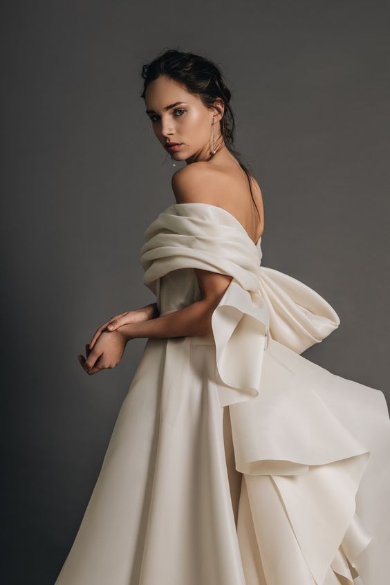 This masterpiece is a testament to modern elegant design, blending classy sophistication with a unique, almost architectural form. The bold, sculptural bow and off-shoulder neckline echo the old money aesthetic with a modern simple twist. It’s an elegant yet powerful gown that would make a statement for any bride, resonating with the minimalist, yet striking choices of Ariana Grande or Meghan Markle. This dress redefines the princess silhouette for the modern era, perfect for a court-style wedding with a romantic and aesthetic atmosphere.