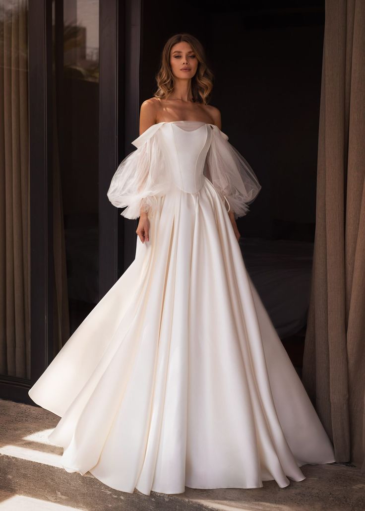 With its structured bodice and dramatic off-shoulder tulle sleeves, this gown is a nod to modern elegant bridal fashion. It’s a unique dress that might be seen on the likes of Ariana Grande—classy yet modern simple in its execution, with a voluminous skirt that commands attention and promises a grand entrance. This gown is for the bride who stands at the intersection of old money elegance and contemporary charm.
