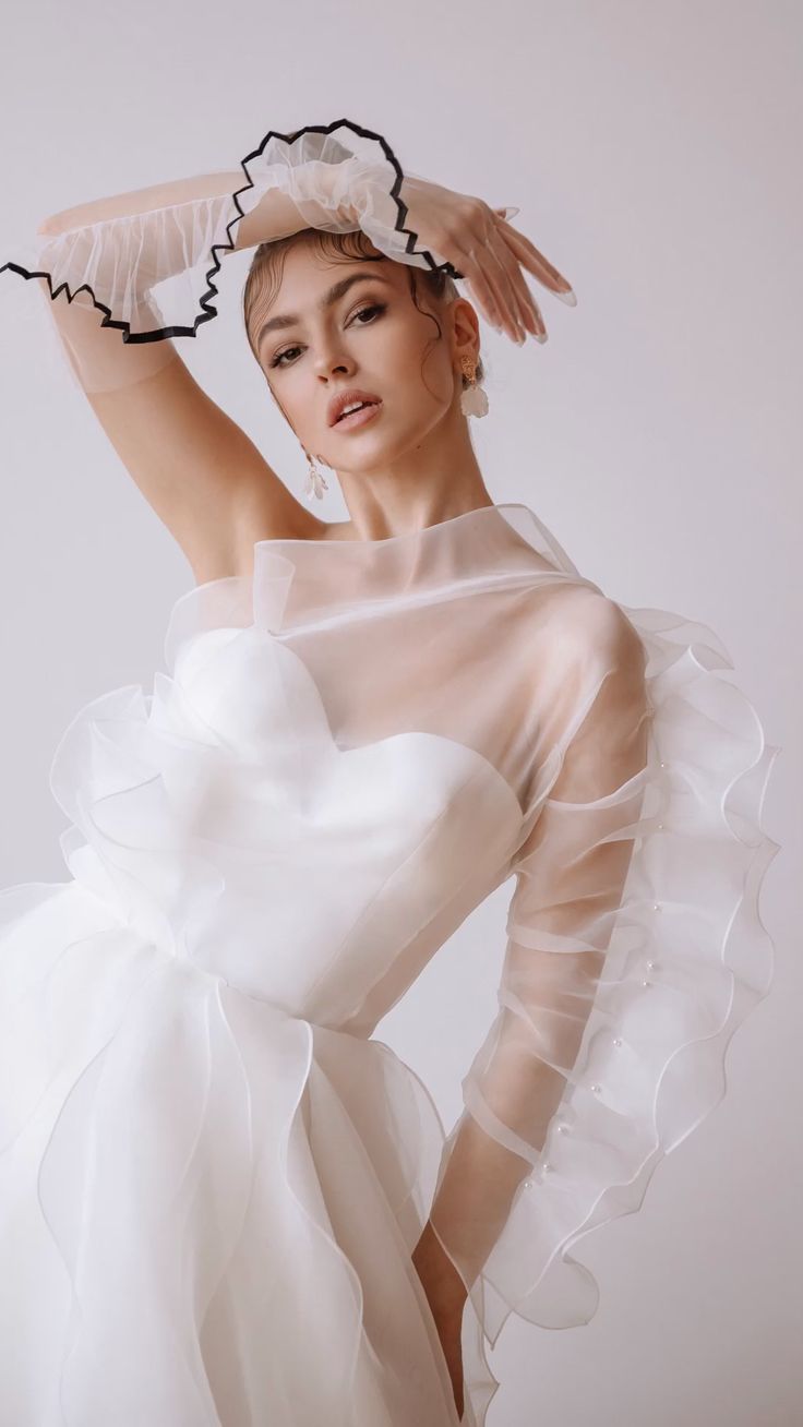 This gown is a daring blend of classy and modern elegant, with structured ruffles and sheer elements that seem to defy gravity. It’s a dress that would stand out in a Game of Thrones epic or during a twilight garden ceremony, offering a unique and artistic take on the princess aesthetic. It’s simple yet elegant, vintage yet fresh—a romantic choice for the bride who is both a dreamer and a trendsetter.