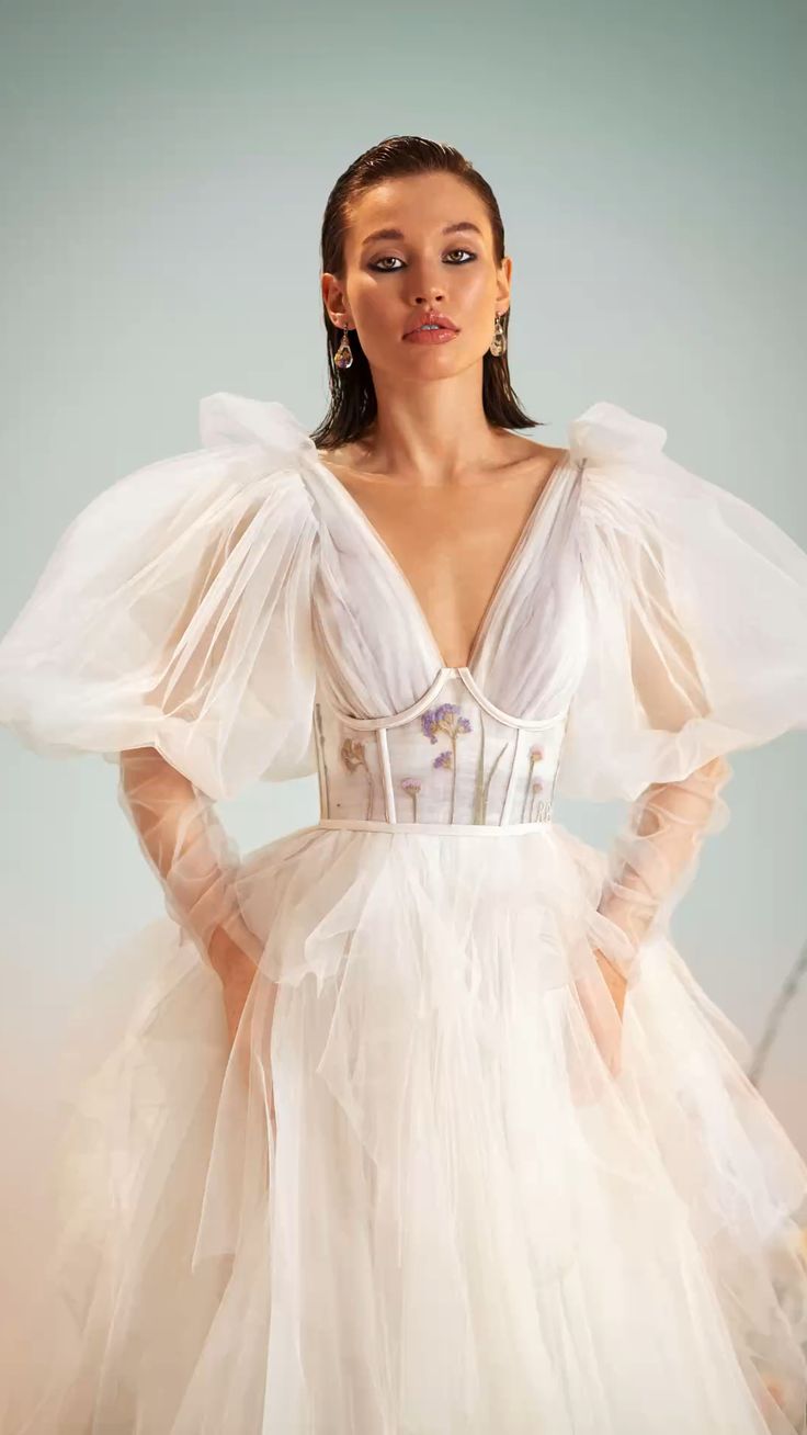 Invoking the whimsy of Ariel or the elegance of Kate Middleton, this gown features puffed, sheer sleeves and a plunging V-neckline, adorned with floral accents that seem to bloom from the fabric. It’s the perfect blend of romantic and elegant, with a hint of modern simple design. The sprinkling of iridescent details throughout the tulle whispers a vintage aesthetic—a truly unique piece for a fairytale wedding.