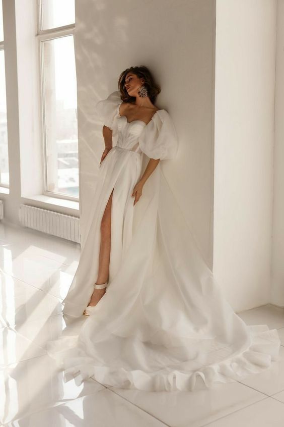 Channeling Meghan Markle’s sleek style with a touch of Hailey Bieber’s modernity, this gown features long, lace-detailed sleeves and a high slit, perfect for a bride who embraces both elegance and a hint of allure. The fitted silhouette is simple yet classy, with a romantic train that ensures a memorable walk down the aisle.
