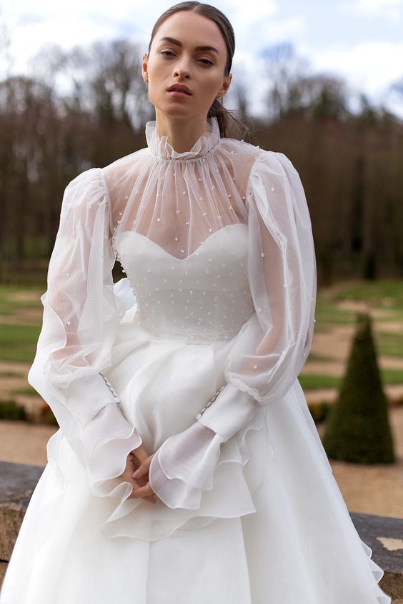 This gown is a beautiful homage to the classy elegance that could be straight out of a Disney princess’s wardrobe. It features a high-necked, sheer bishop sleeve and a sweetheart bodice, sprinkled with subtle embellishments that catch the light like the first stars of twilight. The structured waist flows into a full skirt, creating a silhouette that could have graced the likes of Princess Diana or Audrey Hepburn. It’s a dress that embodies the royal and aesthetic vintage vibes with its long sleeves and delicate lace, perfect for a bride with a penchant for old money elegance and a modern simple touch.
